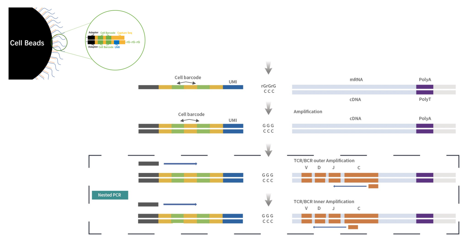 基于华大自主单细胞平台,一次性能够分离 500~10,000 个单细胞,利用 5' 端接头的通用引物和免疫分子恒定区的巢式引物进行 V (D) J 富集,并可以同时测定同一细胞 5’基因表达、TCR/BCR 序列信息,以及 TCR α 链和 β 链的配对和 BCR 重链和轻链配对信息,揭示免疫细胞的复杂性