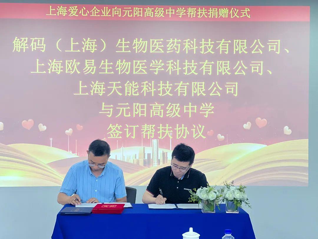 2023年6月1日,在六一儿童节当天,“上海爱心企业向元阳高级中学帮扶捐赠仪式”于上海举行。解码DNA创始人兼CEO潘加奎、欧易生物联合创始人兼副董事长肖云平、天能科技董事长孟诚卫、元阳高级中学校长赵运高受邀参加了本次定向帮扶捐赠仪式。