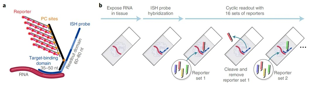 ISH探针分两段,一段是针对目标基因的结合区域(Target binding domain),由长度为35–50 nt的DNA序列组成,该DNA序列将与组织中的RNA靶标特异性杂交;另一段是读出域(Readout domain),用于对该靶标RNA进行表达量鉴定,该捕获序列长度为60–80 nt,由四个连续的10–20 nt DNA序列组成,分别与特定的报告探针(Reporter)进行杂交。报告探针,一部分与Readout domain互补杂交,另一部分与荧光染料结合,在激发光的照射下发出荧光,报告目标RNA的存在。
