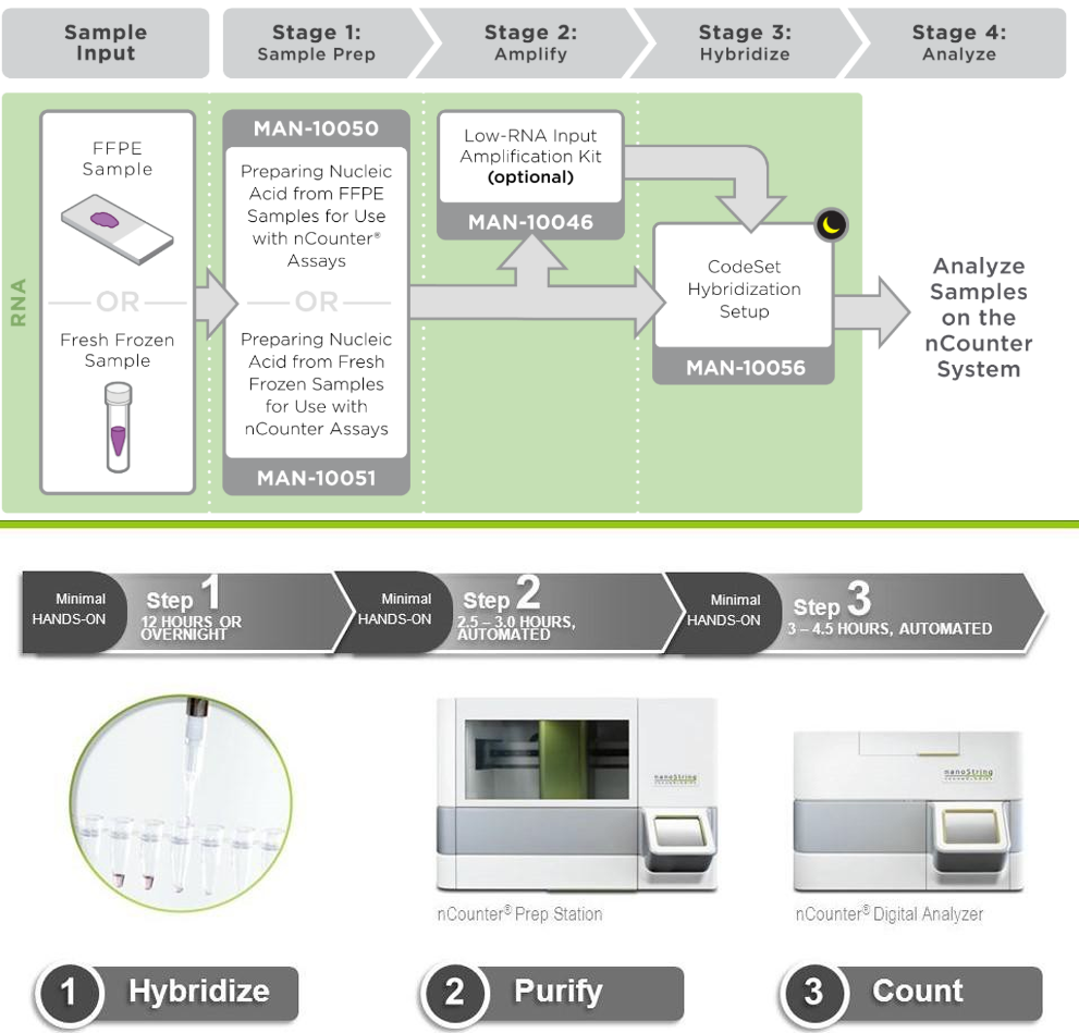 nCounter 的检测系统包括独立的样品纯化工作站和数据信号采集仪;流程包括杂交、纯化固定、计数三个步骤。具体实验流程如下图所示: