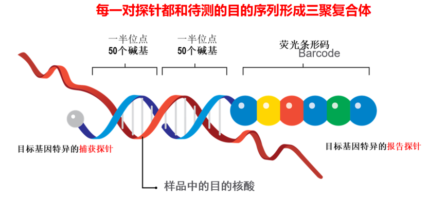 针对每一个靶标的RNA设计一对探针:捕获探针和报告探针,它们分别具有与该RNA互补的一段100个碱基的序列中的前50个碱基和后50个碱基,而捕获探针又在这50个碱基的寡核苷酸链上偶联了生物素,报告探针则偶联了带有6个荧光基团的条形码。该荧光基团条形码是通过4 种不同颜色的荧光基团串联而成的,通过不同的荧光基团的排列组合,该荧光条形码的制备方式可实现对 800 多种不同的RNA的标记。